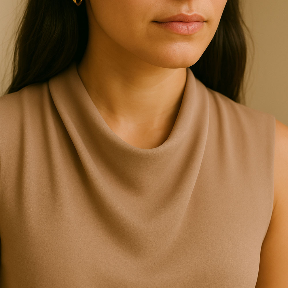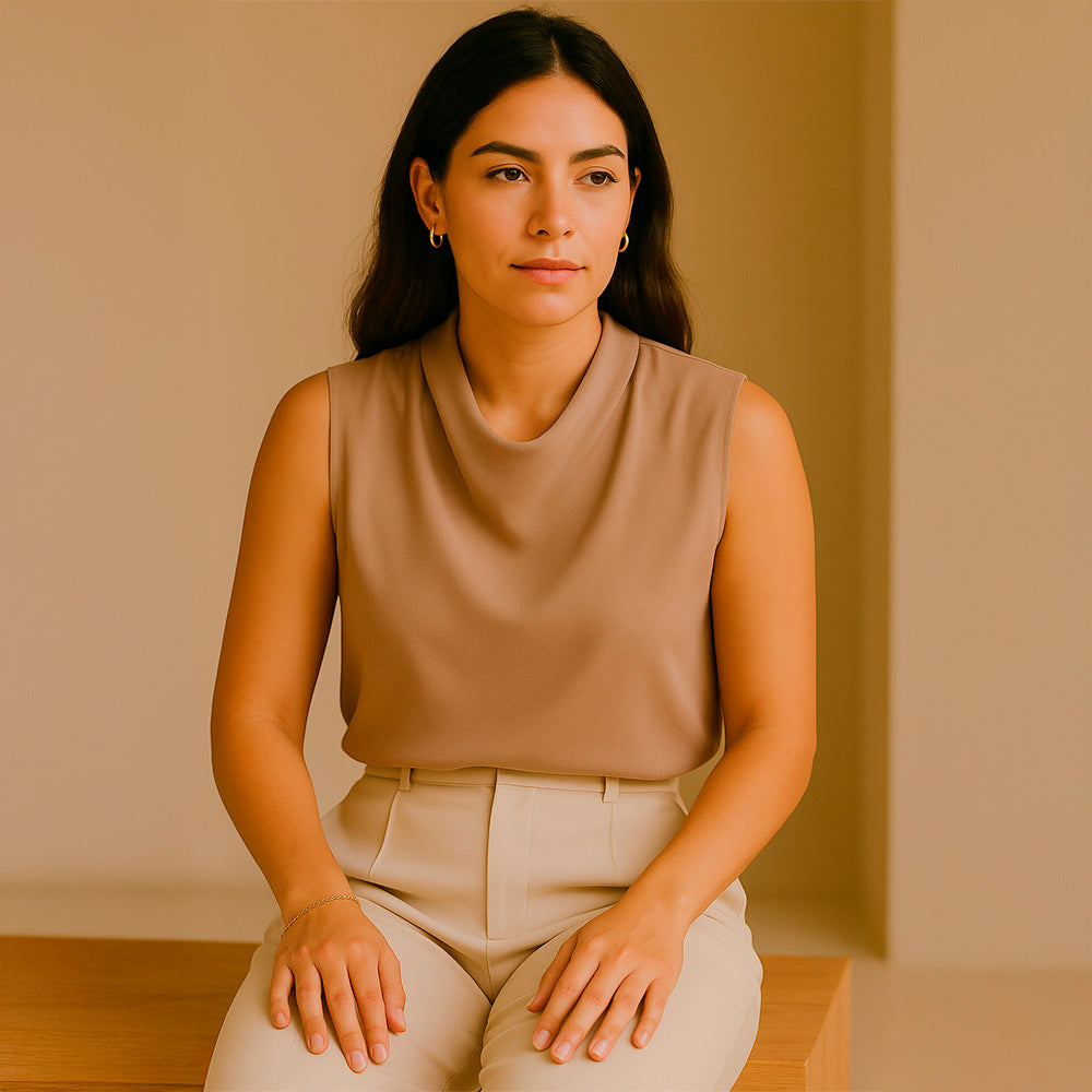 Crafted from a blend of soft, durable fibers, this sleeveless blouse features a flowy design, a draped high neck, and a relaxed silhouette that supports natural body movement.